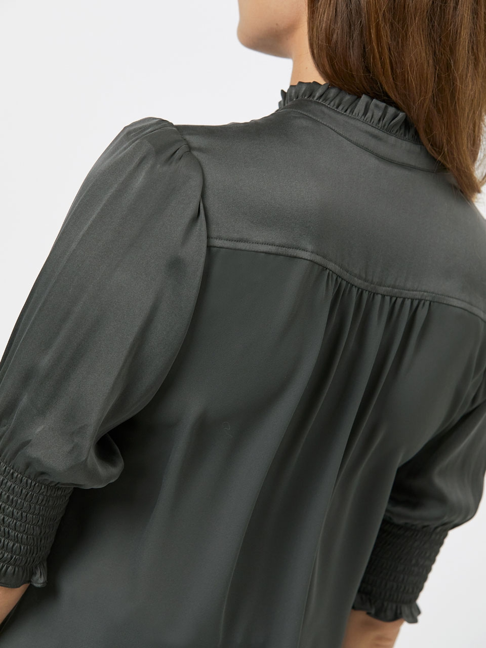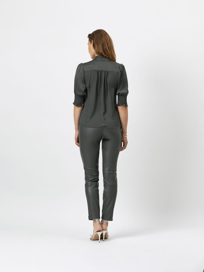 The Allisto top in Urban Grey is made of a supple silk blend and has a crepe georgette back panel. The top has a high-closed collar with ruching and two small buttons for closure. Beneath the buttons there is a subtle oval-shaped cut-out. The shoulders are puffed and the sleeves, which end along the elbow, feature smocked and elastic cuffs with ruching. Wear the top underneath a knit cardigan and pair it with leather pants for an every-day sophisticated look.