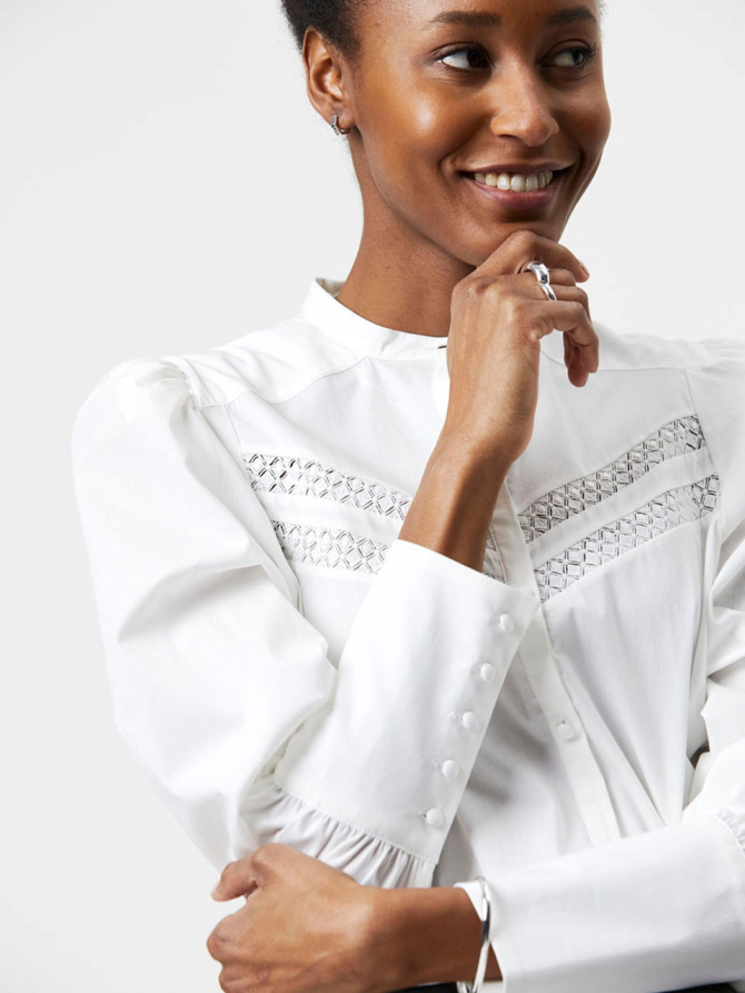 Option for softer lines this season with the Marvelous lace detailed blouse in Milk White. Made from a stretch poplin that contains responsible cotton, it is the perfect sustainable choice. The blouse features a round high-neckline and puffed shoulders. The cuffs fit snugly and reach slightly higher than the wrist. The blouse is detailed with lace to add some accents. Wear this blouse with a pair of flared jeans for a perfect brunch outfit.