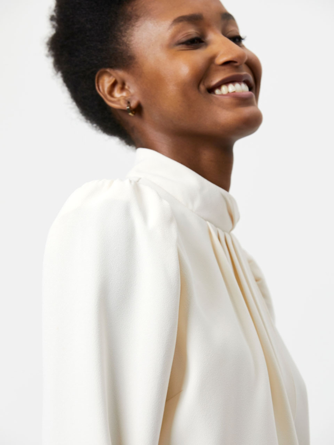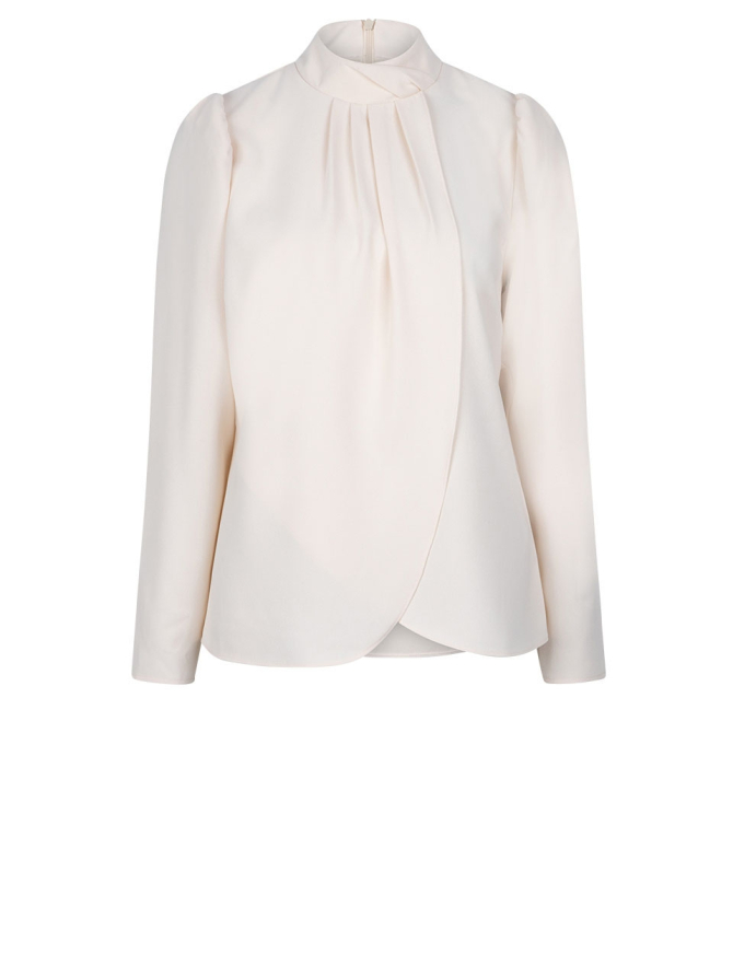 The Ode detail top in Butter Cream is the perfect item to wear from work to party. Made of a Polyester crepe with a satin back that falls lightly and comfortably. The top features accentuated puffed shoulders with pleating around the stitching. It has a drape wrap-over collar at the front. Wear this top with a pair of leather pants for an easy-going everyday outfit or combine it with a suit pants for a smart office look.