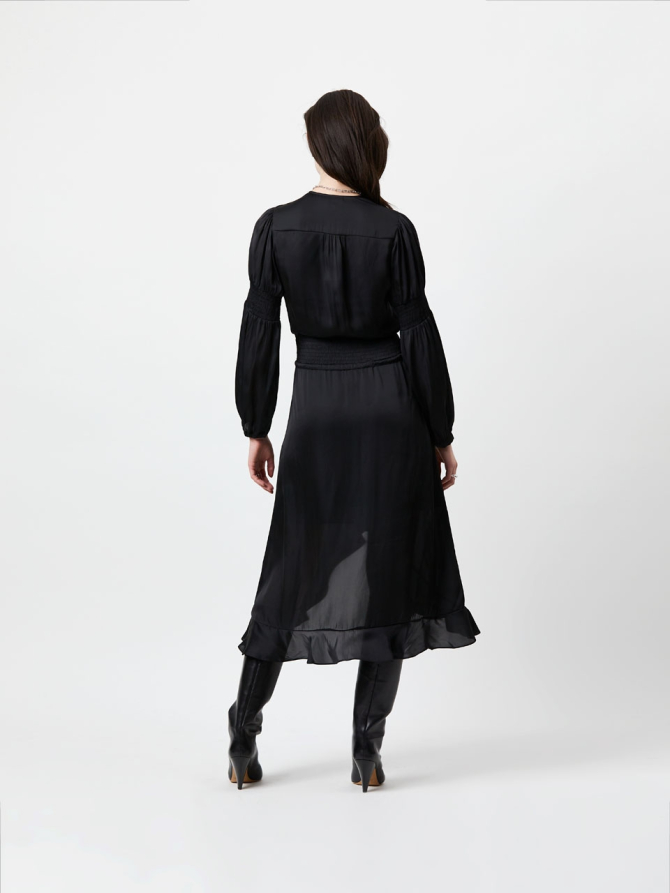 The Rumba flirty midi dress in Raven is an elegant dress for every occasion. Made from a drapey polyester it includes an anti-static finishing. The material falls nicely around the body, with an elastic waistband that creates a beautiful feminine silhouette. The long sleeves feature an elastic detail at the upper arm to create the appearance of puffed sleeves, and the wrap skirt is nicely detailed with ruffles for a flirty movement. Style it with cool boots for a festive occasion.