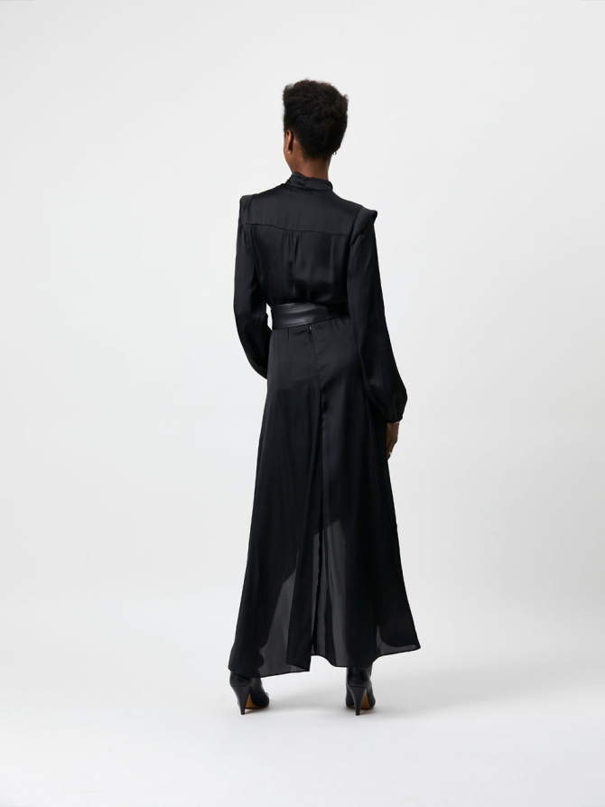 The Sora plain long skirt in Raven is an understated design that retains maximum impact. Made from a drapey satin with anti-static finishing, it sits high at the waist and falls to the floor with a wide, open, fluid cut. The skirt is shorter at the front, and longer in the back which creates the illusion of longer looking legs. Style yours with the matching blouse to create an elegant yet sophisticated look from desk-to-dinner.