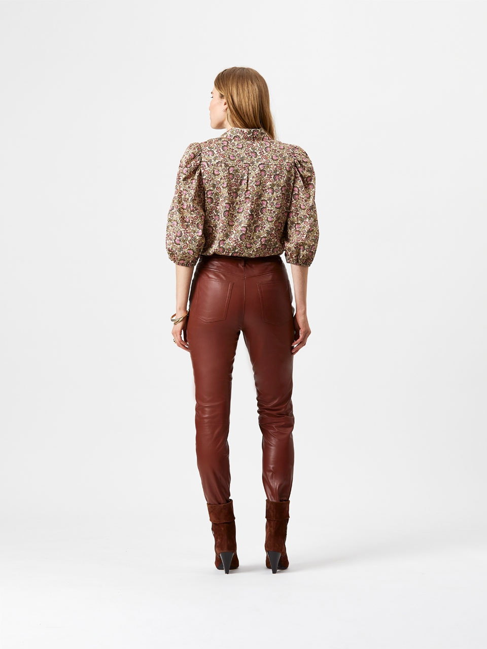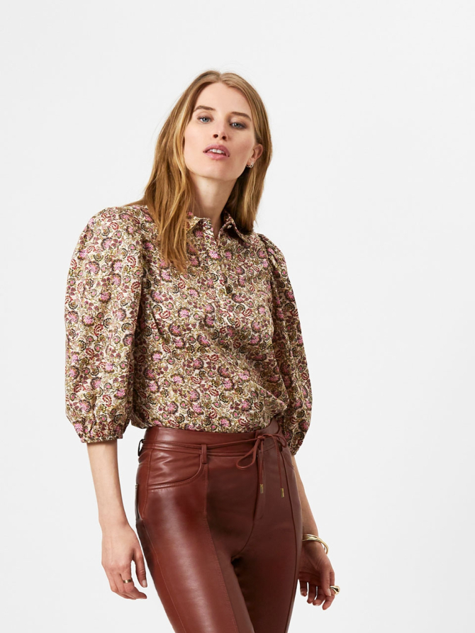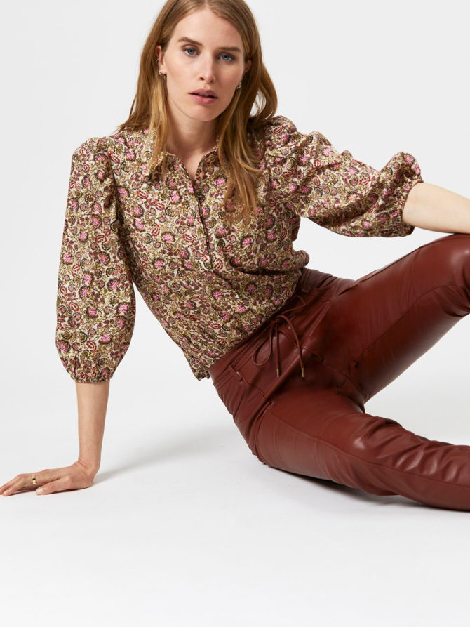 The Yuna printed blouse is a luxury piece to stand out this season. Made from floral printed satin touch cotton, it has puffed sleeves and a button closure. Combine it with a leather pants in a similar hue for a casual yet feminine look.
