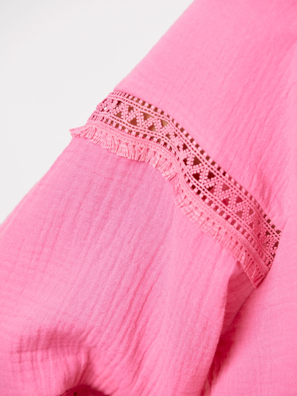 The D6Nynke bohemian top in Pink Glow captures the spirit of a classic design with enduring appeal. Crafted from a Cotton double cloth with responsible cotton, it has on oversized fit with dropped shoulders. The top features a high neckline with elegant, ruffled trimming and bohemian details on the puffed sleeves. Perfect to match with the matching D6Dorso shorts for an effortlessly chic look.