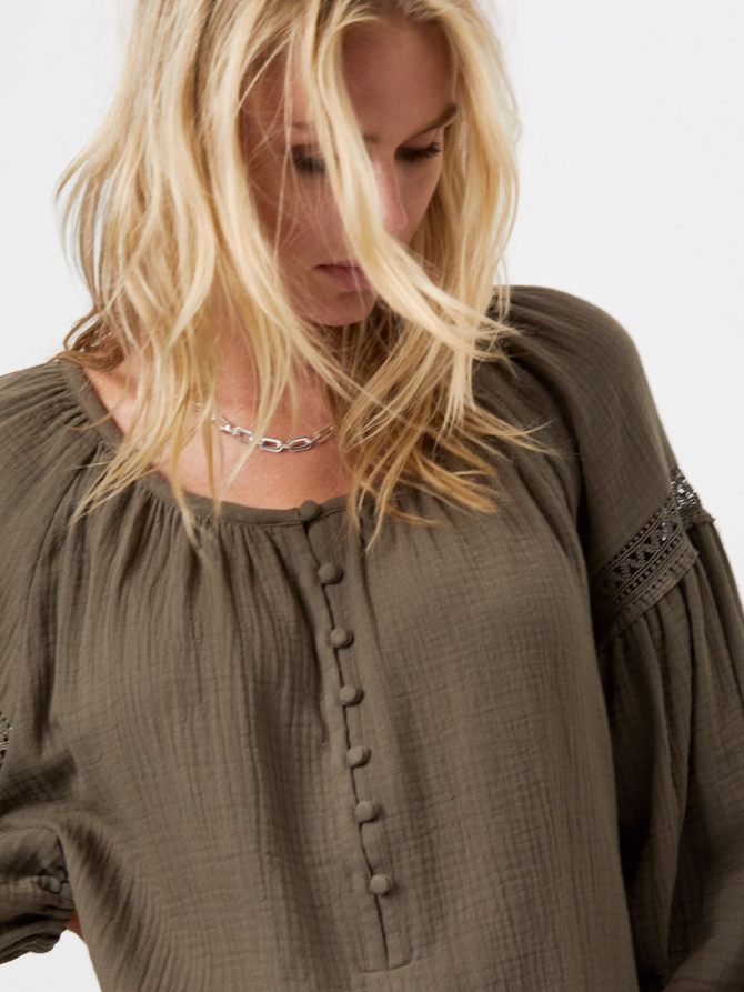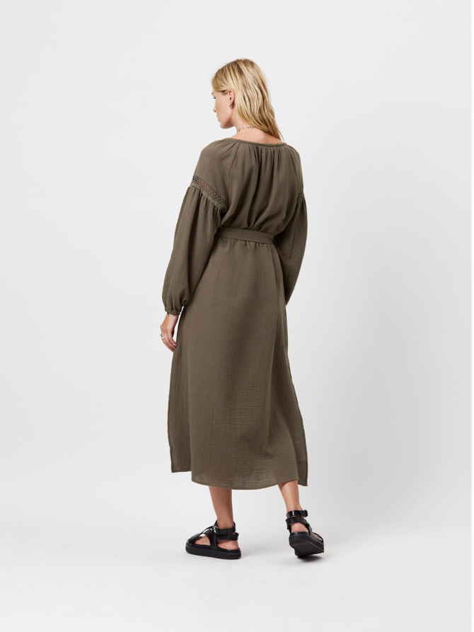 The long airy D6Chelsey maxi dress in Thyme Green has an easy silhouette for any outings. Crafted from a Cotton double cloth with responsible cotton, it has an oversized fit with dropped shoulders with bohemian details. The dress is designed with a round neckline and comes with a matching tie-belt to create a feminine silhouette. It’s the perfect slip-on-and-go choice after a long day at the beach.