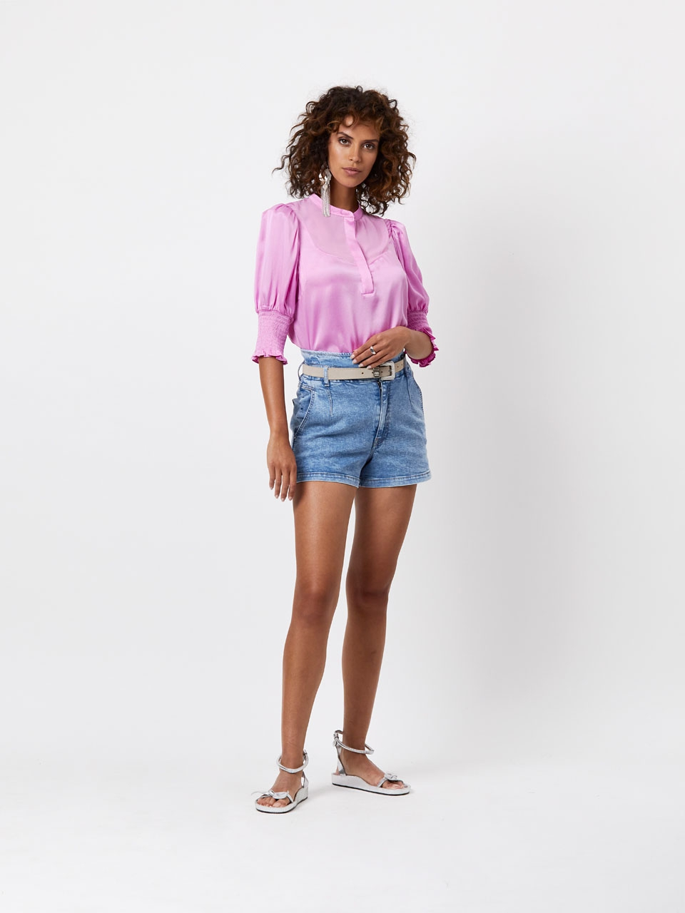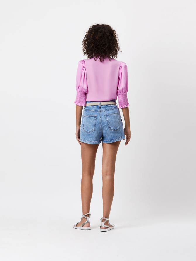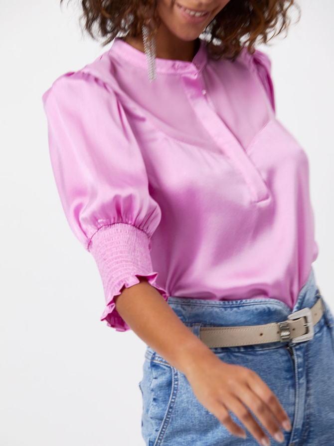 The D6Hilson detailed top in Candy Pink is made of a supple silk mix blend with polyester crepe georgette inserts. The top has a high-closed collar with hidden button closure. The shoulders are puffed and the sleeves, which end along the elbow, feature smoked and elastic cuffs with ruching. Wear the top underneath a knit cardigan during chilly days for an every-day sophisticated look.