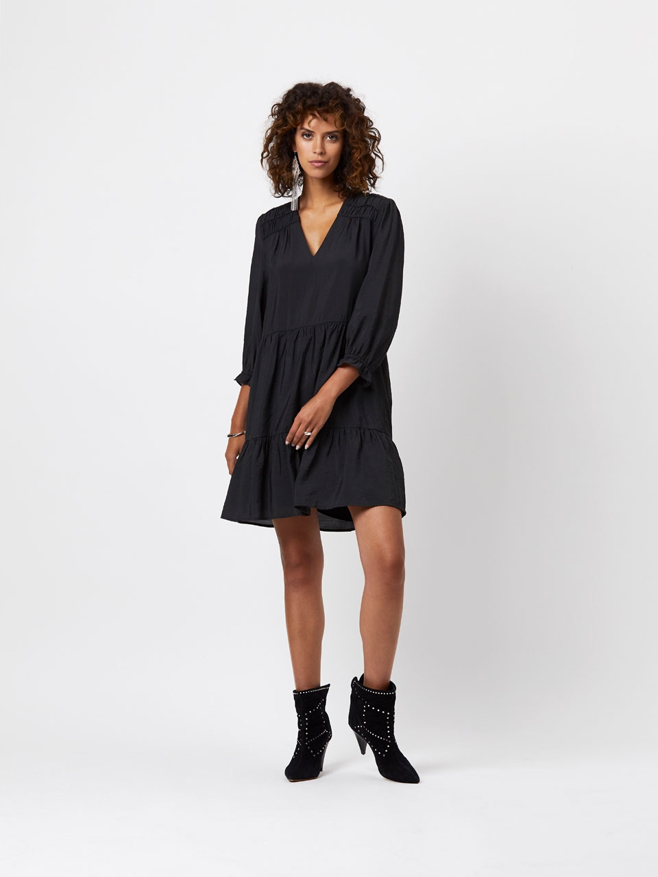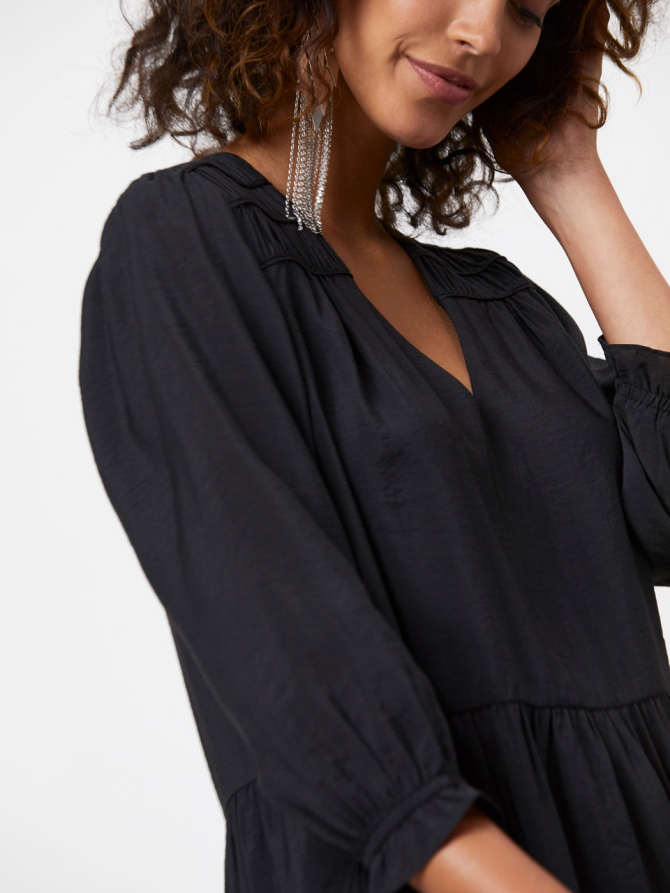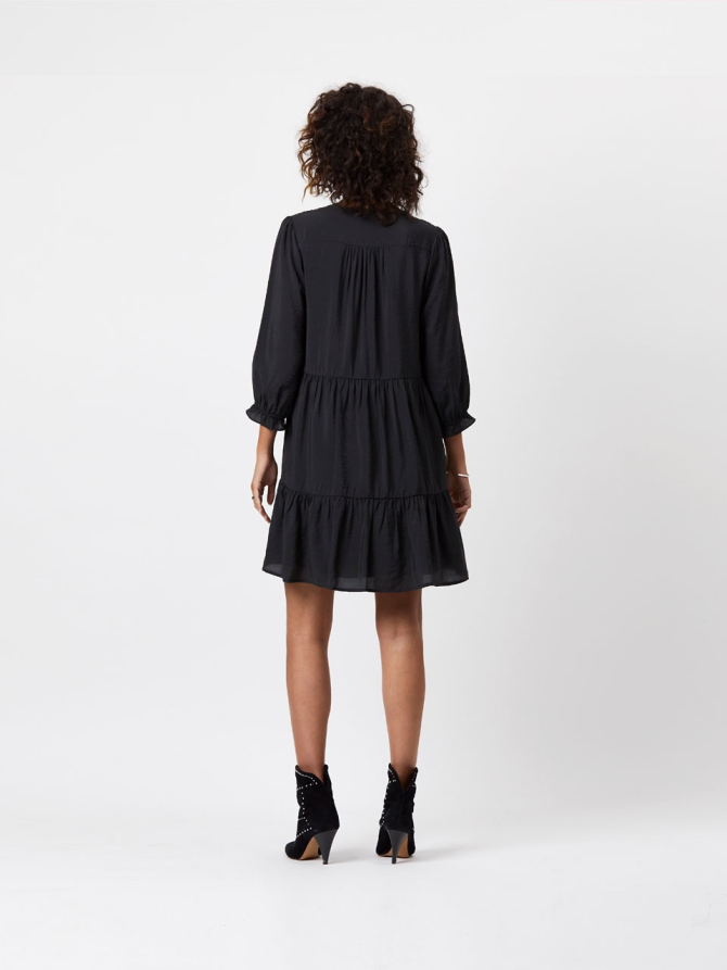 Slip on the D6Starlight mini dress in Raven when vacation is calling. Made from a lightweight acetate/modal blend, it has a lining made of viscose voile. The dress has A-line silhouette, a v-neckline and slightly puffed sleeves that fall below the elbow, adorned with ruffles. The skirt of the dress has subtle trimmed hem panels to elevate the legs. Wear it with short booties and be ready for any occasion.