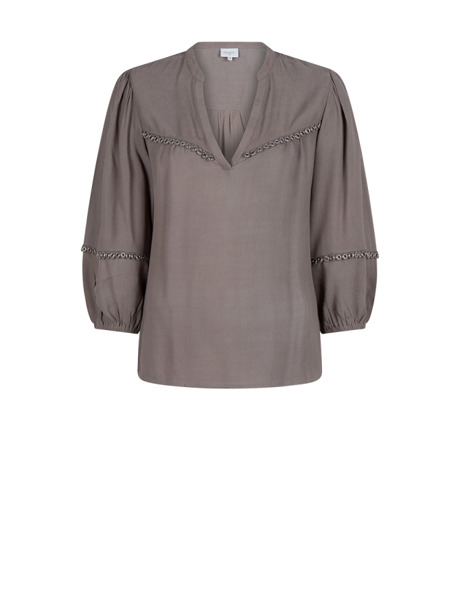 Defined by its embellished eyelet details, the D6Vale top in Warm Grey is a true style essential to hold onto for a lifetime. Made from 100% Ecovero viscose crepe with metal eyelet trim, it has a deep V-neckline and long puffed sleeves to create a powerful look. Create a statement outfit by matching it with the ruffled skirt and summer sandals.