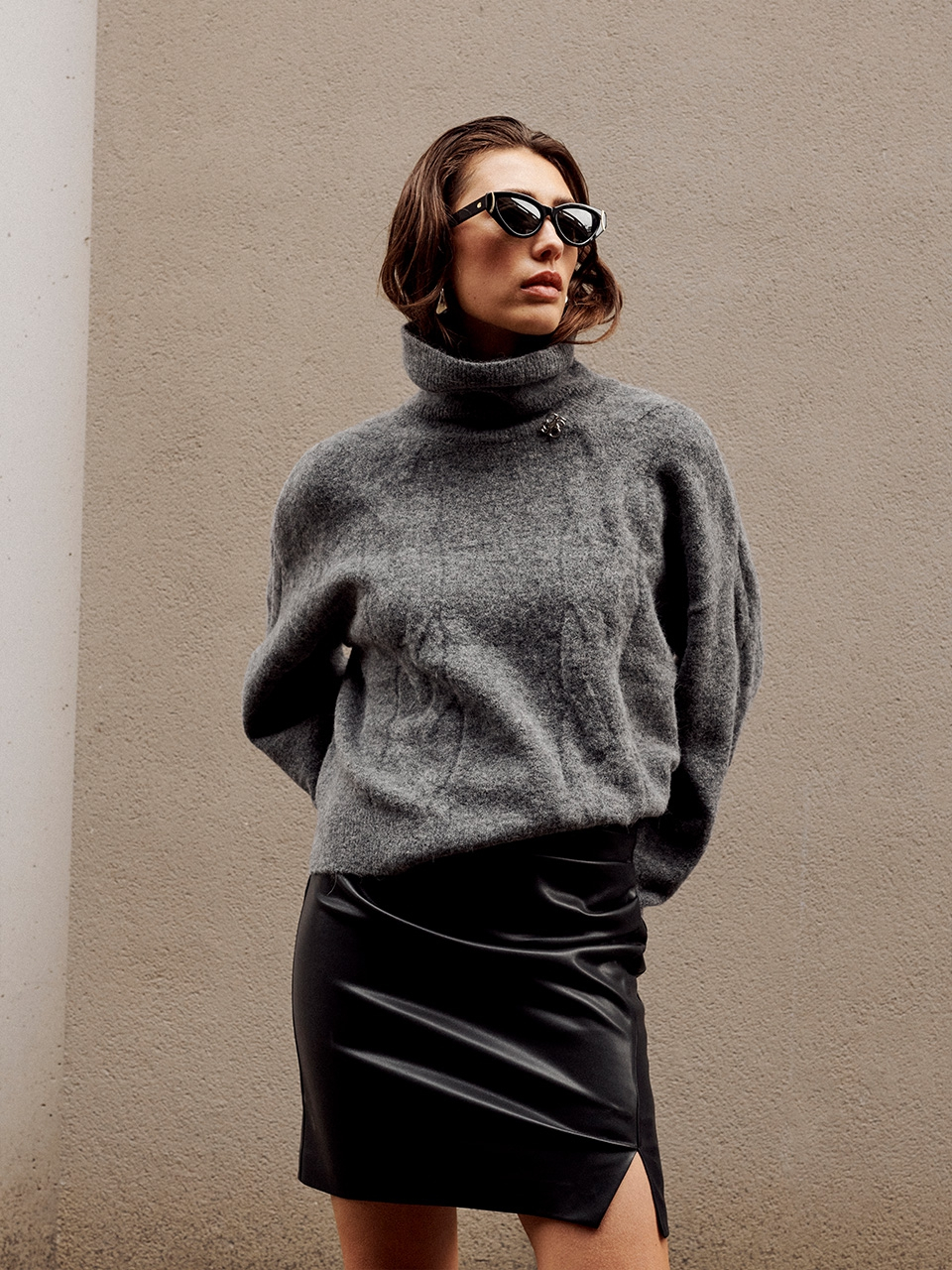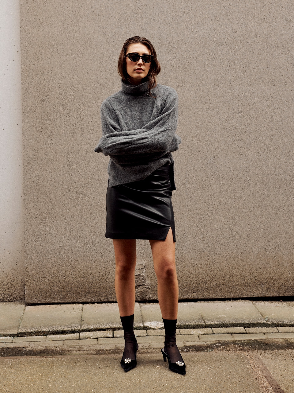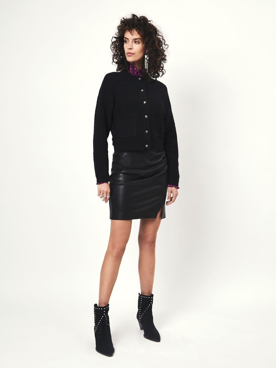 The D6Taylinne faux skirt in Raven is a stylish and versatile addition to your wardrobe. Made with polyurethane and polyester with a 100% polyester satin lining. With its timeless and striking design, this skirt is sure to make a statement. The faux leather material provides a sleek and edgy look that never goes out of style. This skirt has a concealed zipper at the back. Wear yours with the matching D6Elvis bomber for a full leather look.