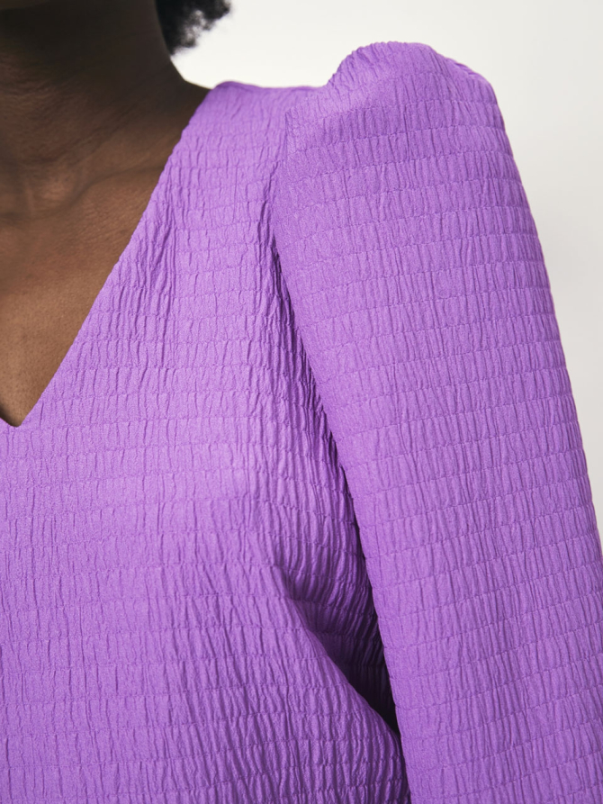This romantic V-neckline top is made of a textured, stretch, light weight dobby. It has voluminous sleeves, which are created through the pleats at the shoulder. These narrow down towards the sleeve opening into an additional pleat. Make a minimalist but striking statement with this top.