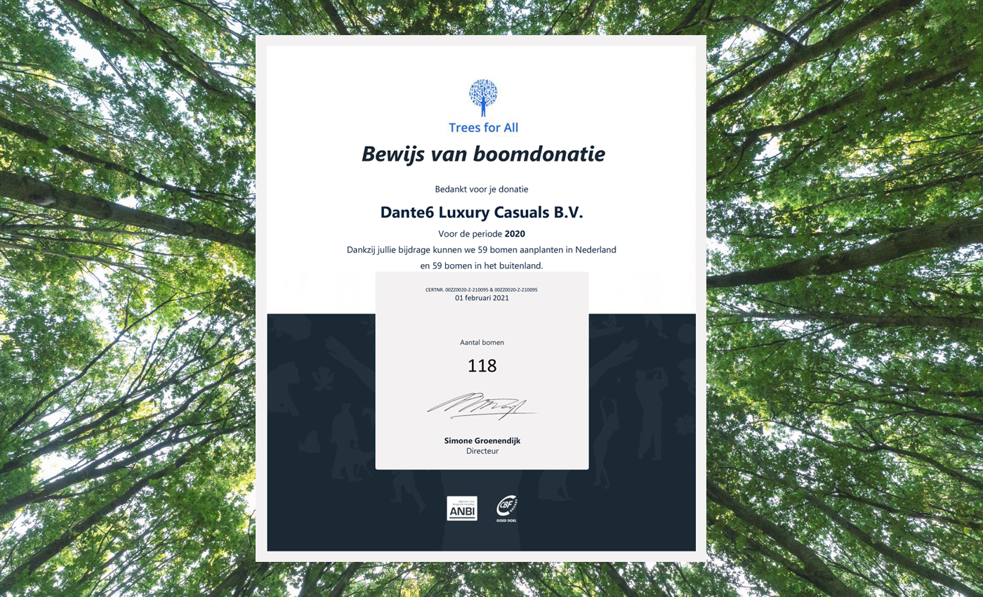 Because we care about the environment, we signed a partnership with Trees For All. Each year, they will plant trees in both The Netherlands and in other countries, for all birthdays of the employees within Dante6. And last Black Friday, we turned it into Green Friday; with every purchase on the website, one could help restoring forests by adding trees at the check-out.