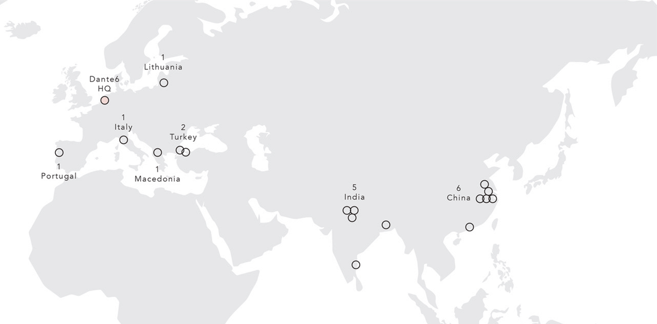 The map above shows where we are making our garments. We operate with 19 factories across Europe, India and China, choosing our partners carefully due to their manufacturing expertise in specific areas. Most partners we have built a relationship with over many years and we work closely together to make the best possible products each season. We conduct regular visits to our factories to ensure they adhere to strict policies regarding health and safety, child labour and living wages.