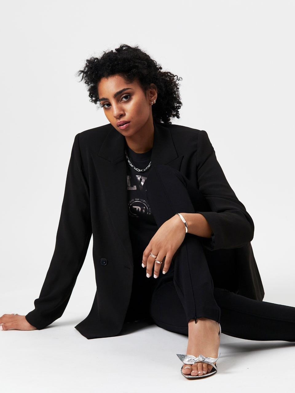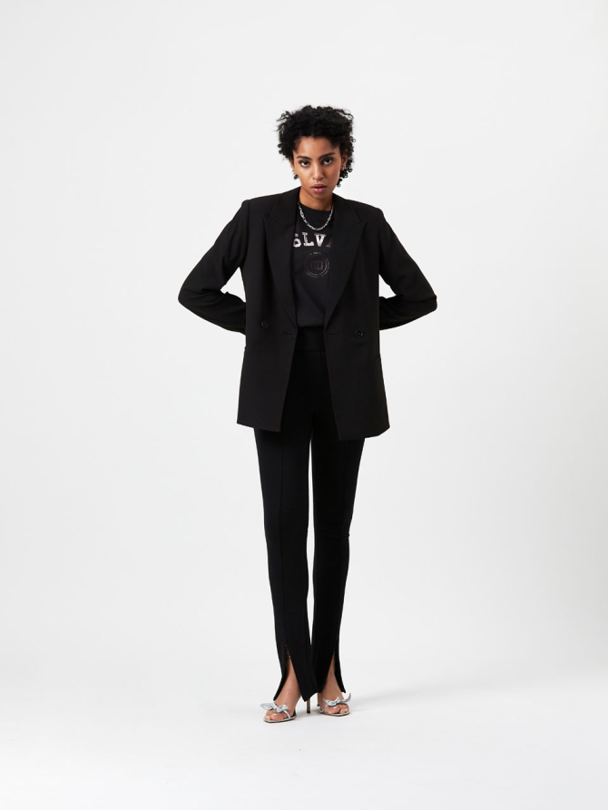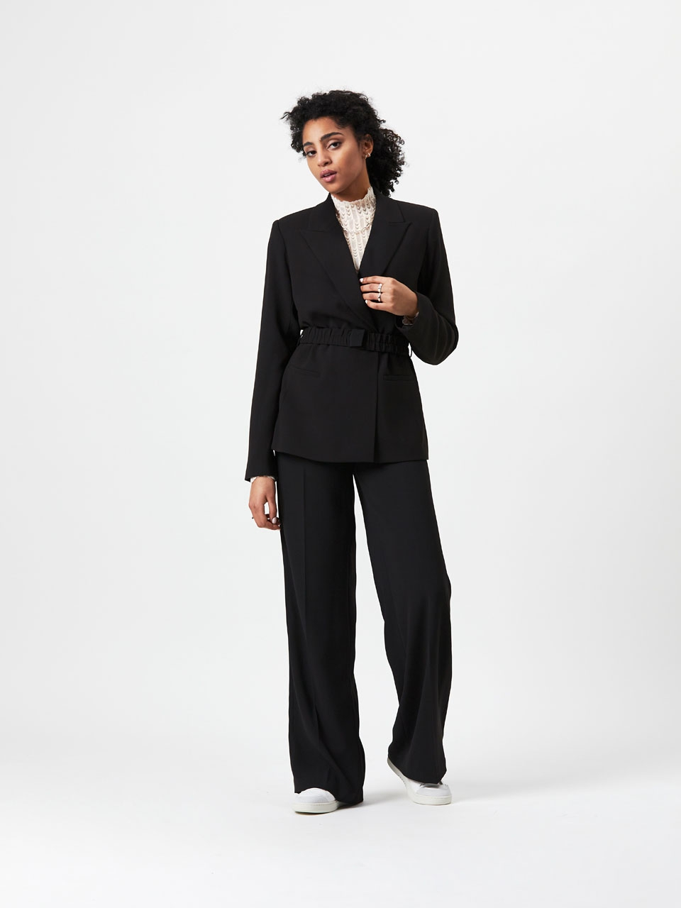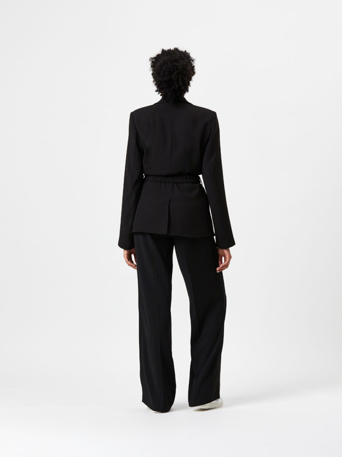 Take a structural approach to dressing with the Memoire belted blazer in Raven. Made of a recycled polyester crepe with a satin back, and 100% polyester sating lining. This blazer features shoulder pads and comes with a matching scrunch belt. Wear yours with the matching Luca pants for a full ton-sur-ton look.