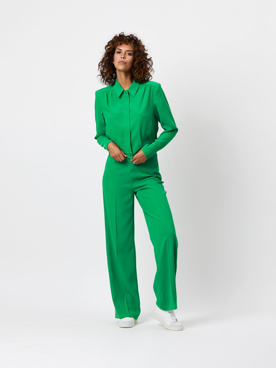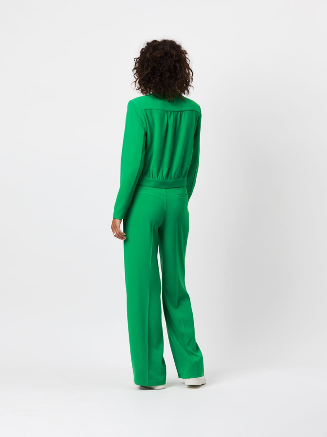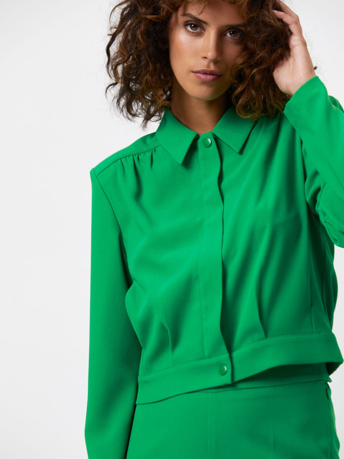 Cast a sophisticated silhouette with the D6Famke cropped jacket in Ultra Green. Made of a satin back crepe, the jacket has a collar neckline that continues down into a hidden button closure. The silhouette of the shoulders is strong with shoulder patches and the sleeves fall to the wrist. Wear this jacket in a monochromatic look with matching pants.