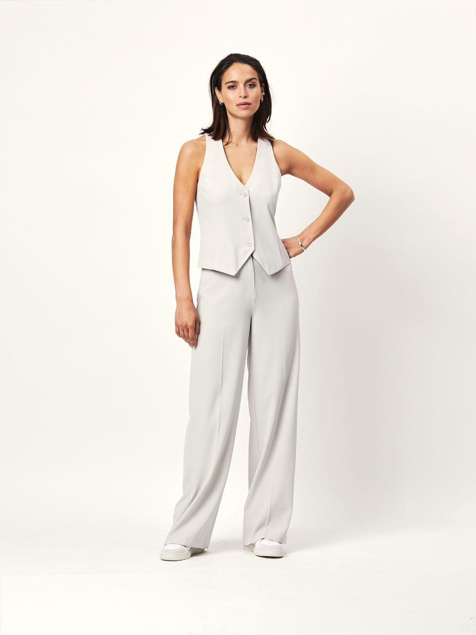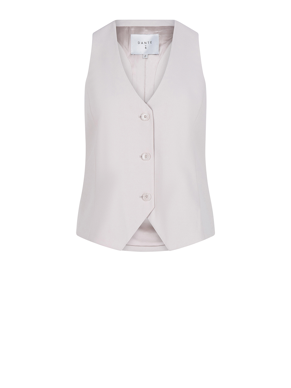 The D6Mavis gilet in Ice Grey reimagines menswear codes with feminine dimensions. The waistcoat is crafted with certified recycled polyester crepe with a satin back, and 100% polyester satin lining. Presented in a single-breasted silhouette with V-neckline and button closure. Wear yours with the matching blazer and pants for a full Dante6 sophisticated office look.