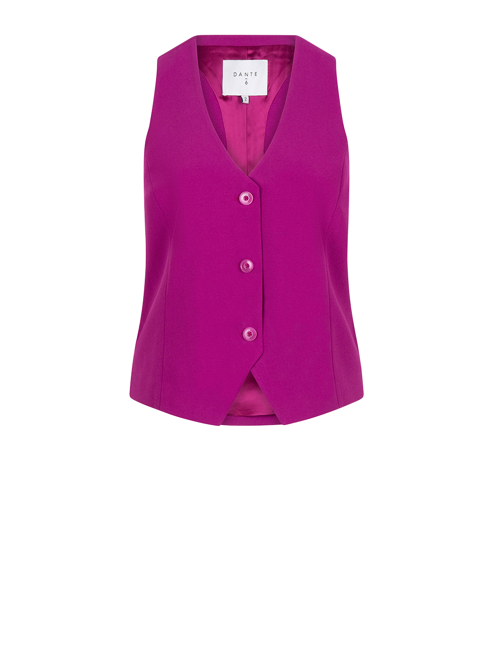 The D6Mavis gilet in Fresh Grape reimagines menswear codes with feminine dimensions. The waistcoat is crafted with certified recycled polyester crepe with a satin back, and 100% polyester satin lining. Presented in a single-breasted silhouette with V-neckline and button closure. Wear yours with the matching blazer and pants for a full Dante6 sophisticated office look.