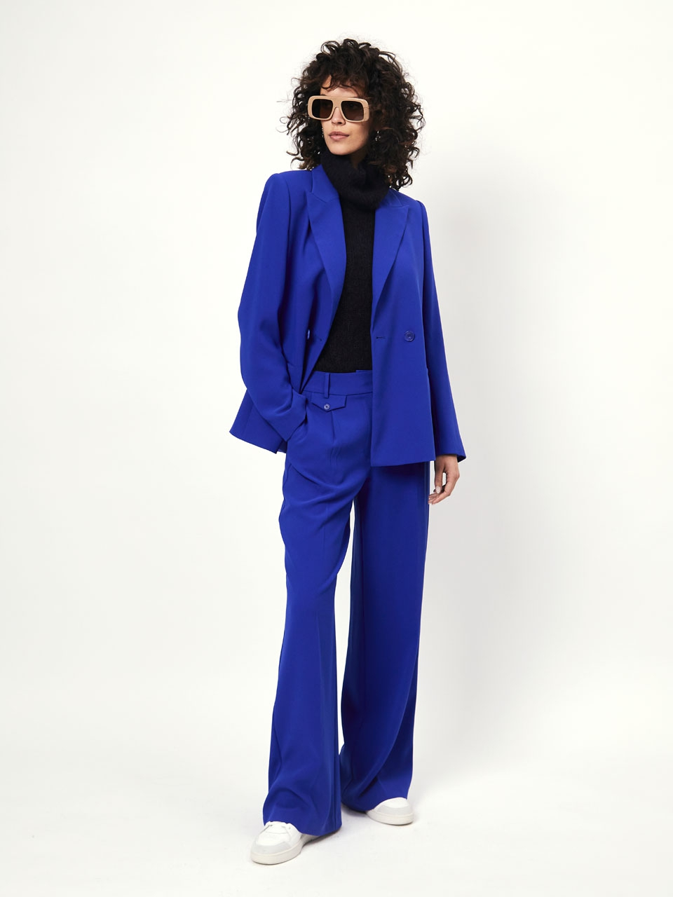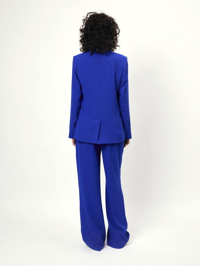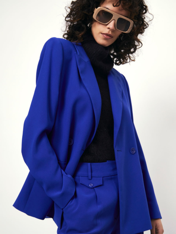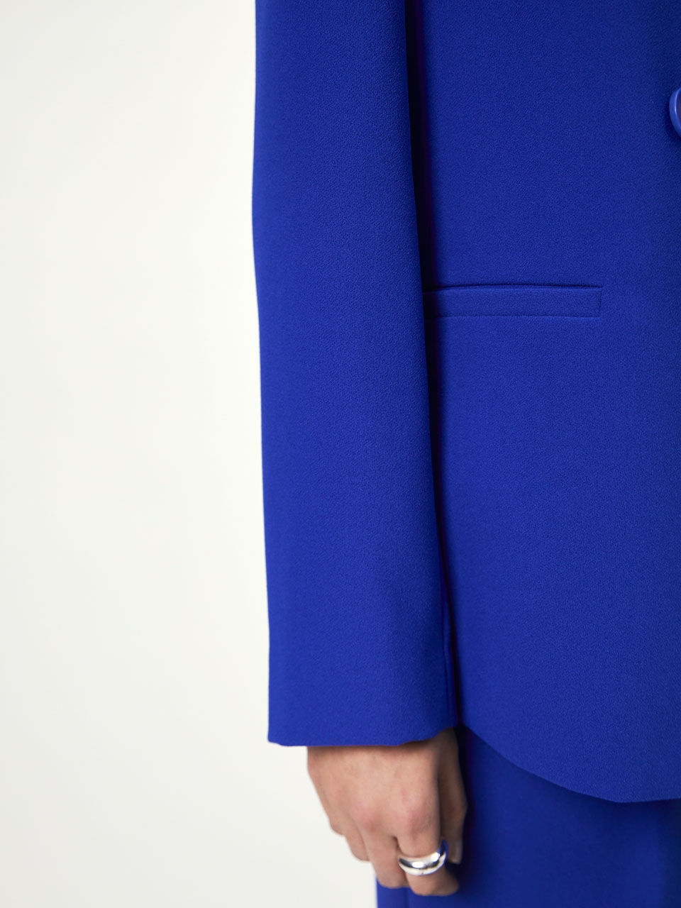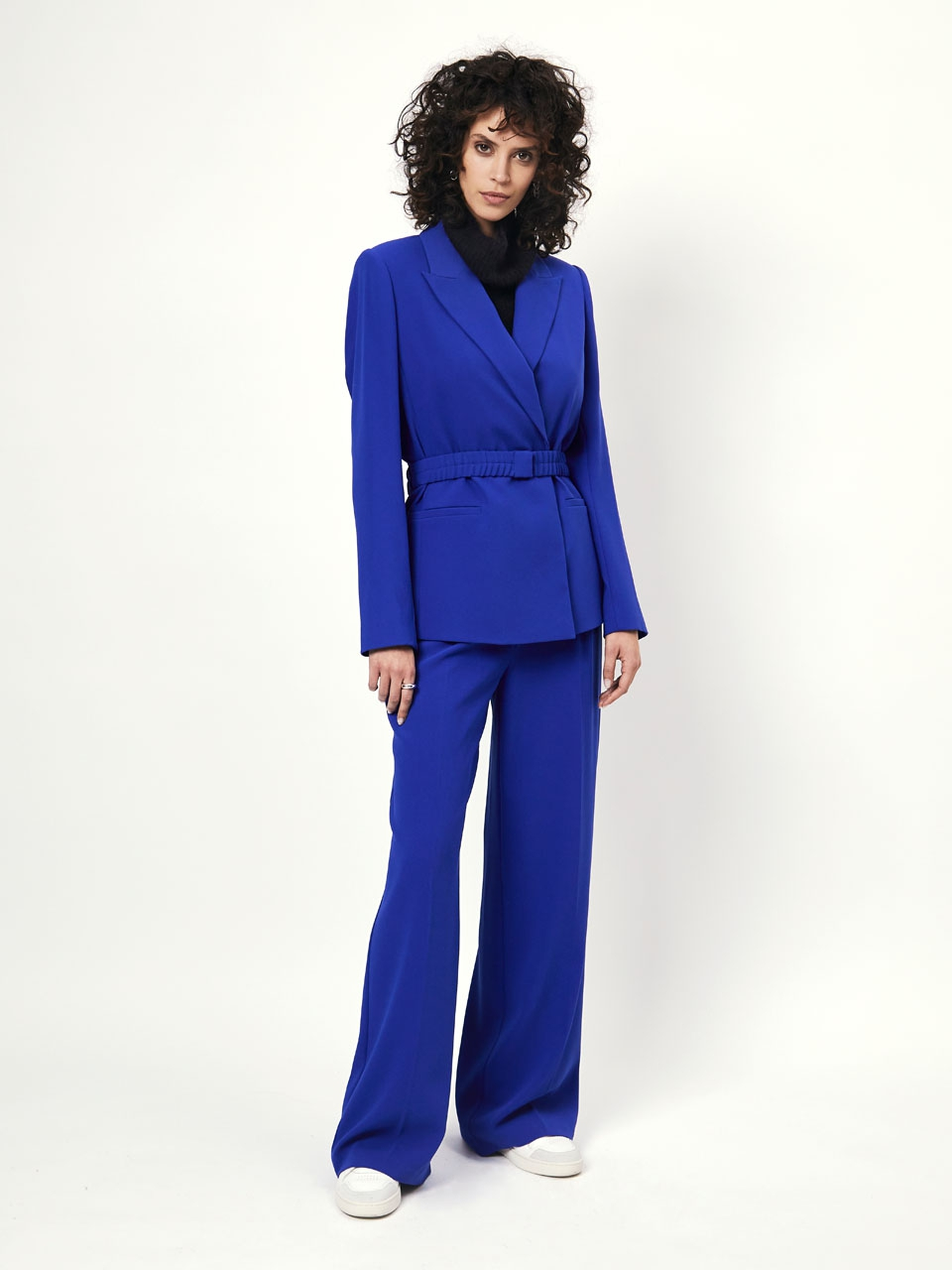 Take a structural approach to dressing with the D6Memoire relaxed fit belted blazer in Vibrant Blue. Made with certified recycled polyester crepe with an 100% polyester satin lining. This blazer features shoulder pads and comes with a matching scrunch belt. Wear yours with the matching pants for a full ton-sur-ton look.
