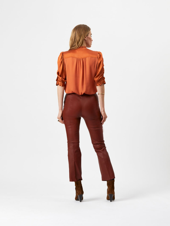 The Tyson crop flare leather pants in Terracotta Brown, made of certified, butter soft lamb leather is an item to truly love and hold forever. It is one of those investment pieces that can be combined with any item in your wardrobe. Wear it with heeled boots and a sweater for an effortless yet chic look.