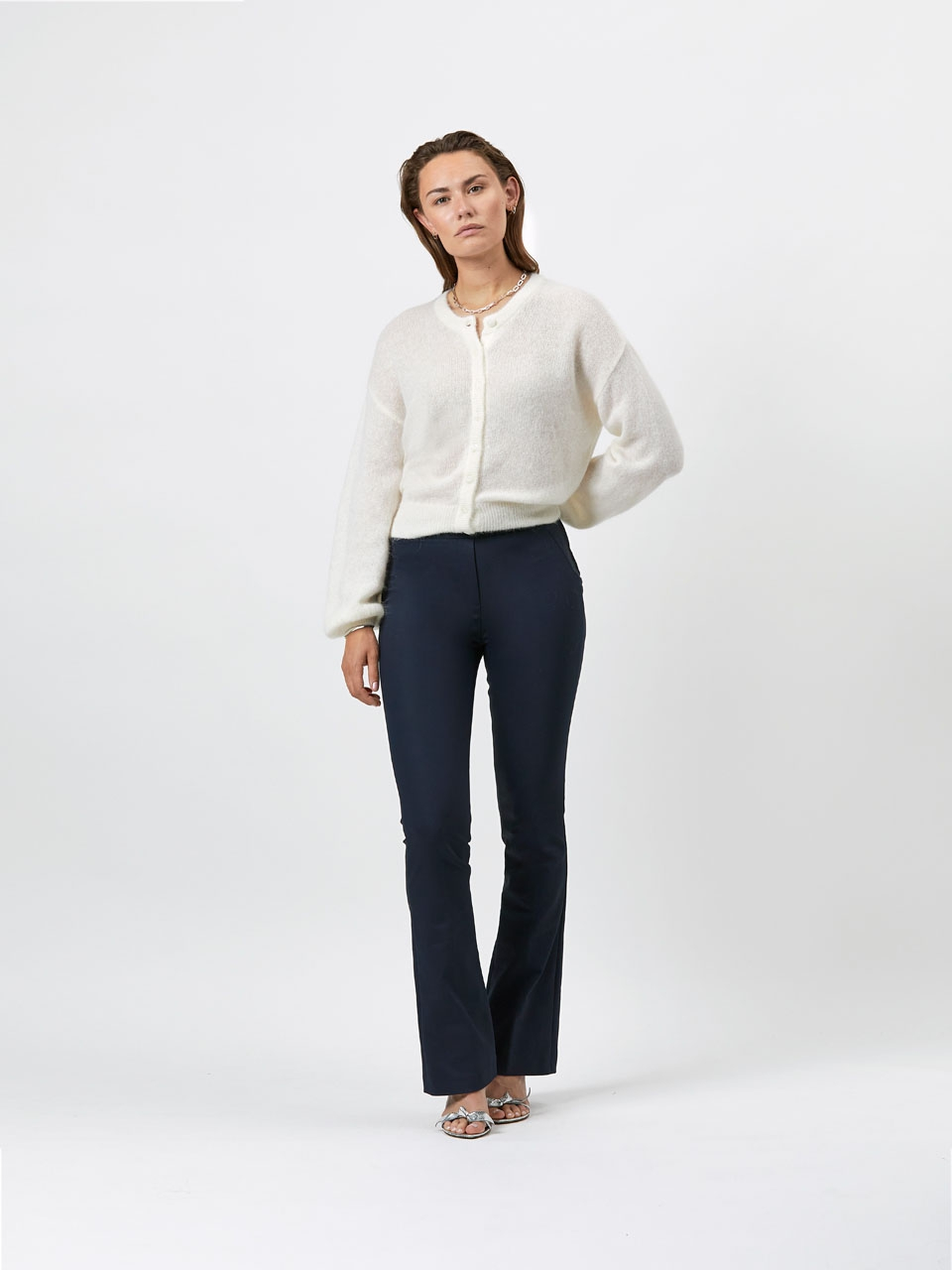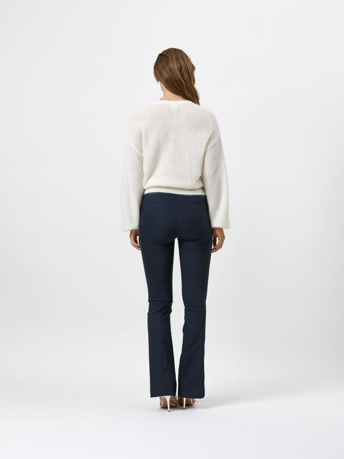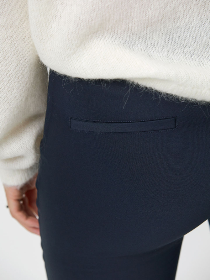 Elegant woven flared pants in Midnight blue The Azumi pants in Midnight Blue. This timeless staple exude elegance with its timeless leg-lengthening silhouette; they fit closely through the thighs before flaring out a bit gracefully. Perfect for a modern business look. Fits perfectly and wears super comfy because of the elastic waistband and firm stretch fabric. • Stitched fake side pockets & back pockets