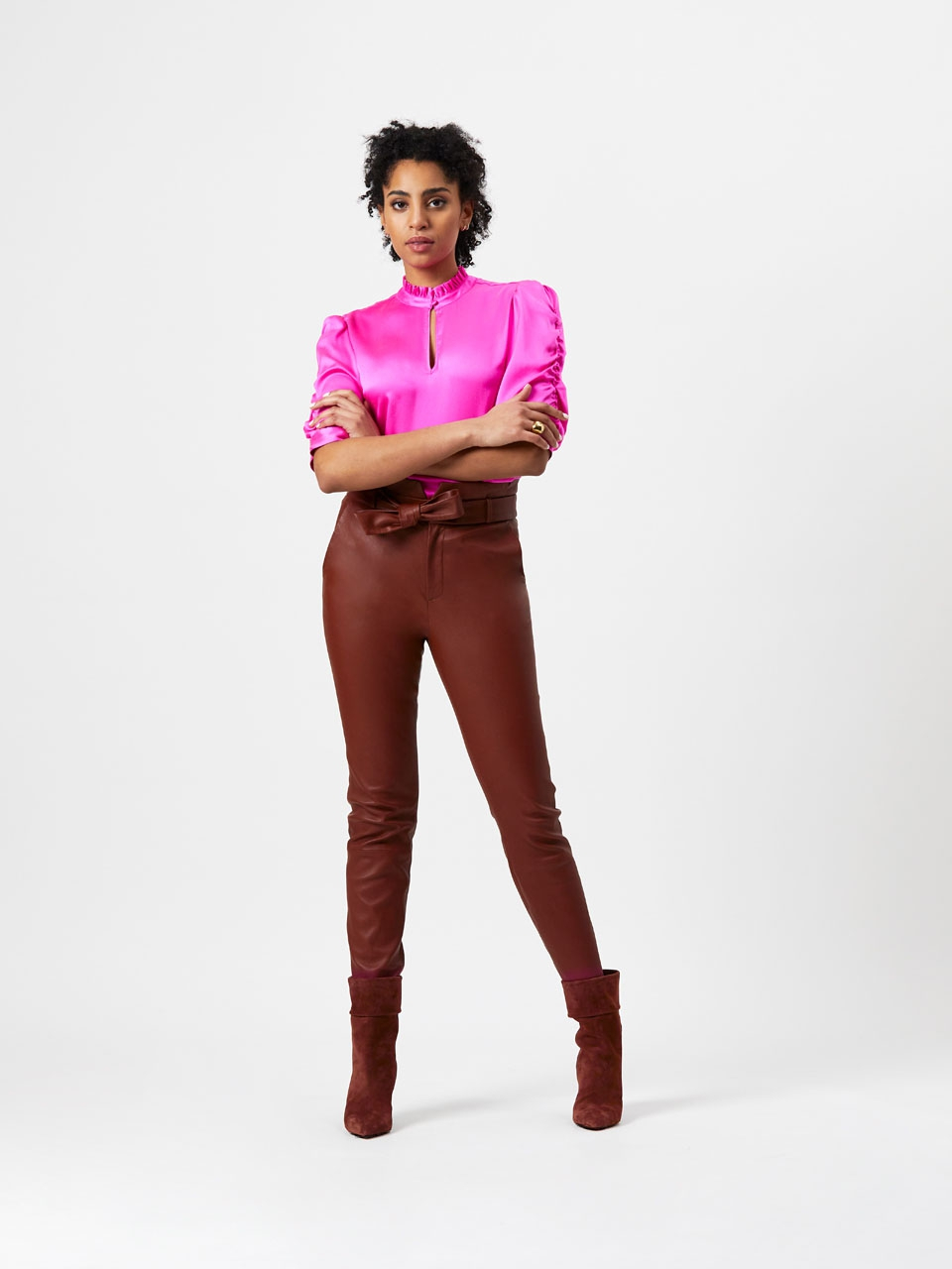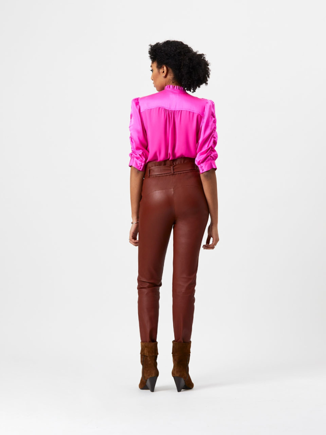 Sure to add character to any outfit, the Carrey stretch leather pants in Terracotta brown is made of bonded stretch lamb leather originating from a certified tannery. It has a bonded backside made of a cotton elastane blend, which makes the pants wear like a second skin. The pants have an elastic high-rise waist in paper bag style and feature two side-pockets. It has a small slit at the bottom of the pant leg and the pants come with a matching leather belt which can be tied at the front. Wear it with a blouse to create a casual air to your outfit.