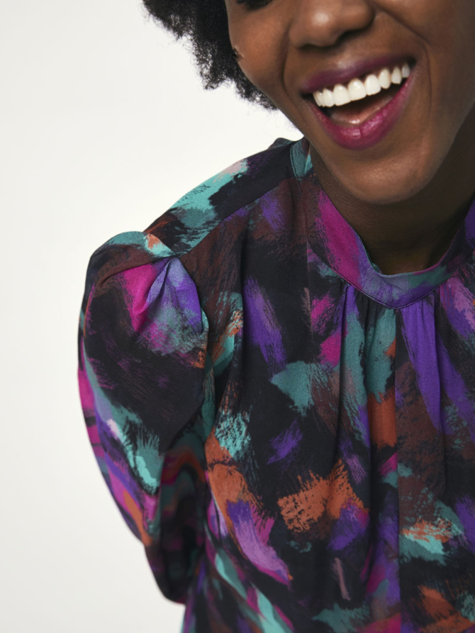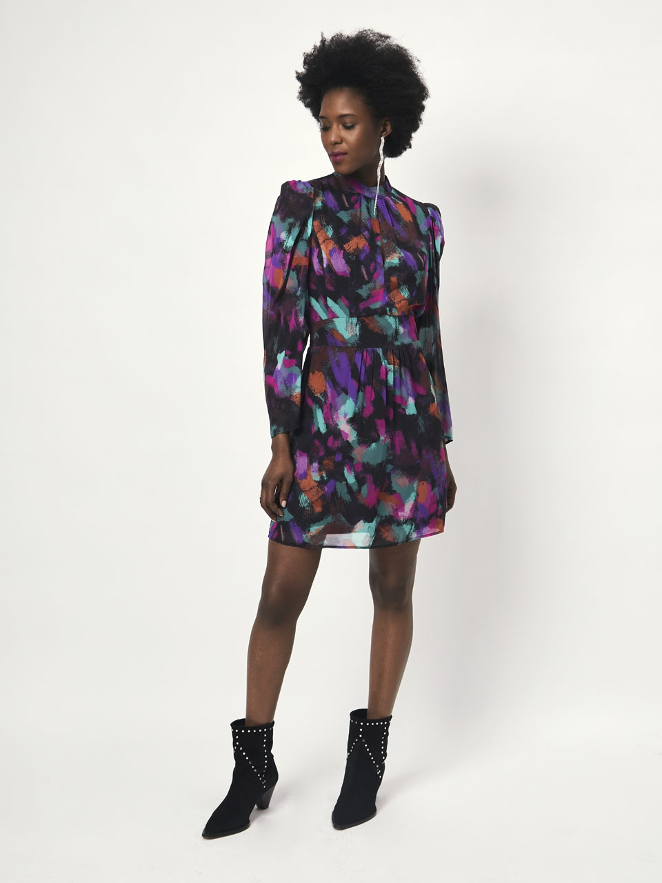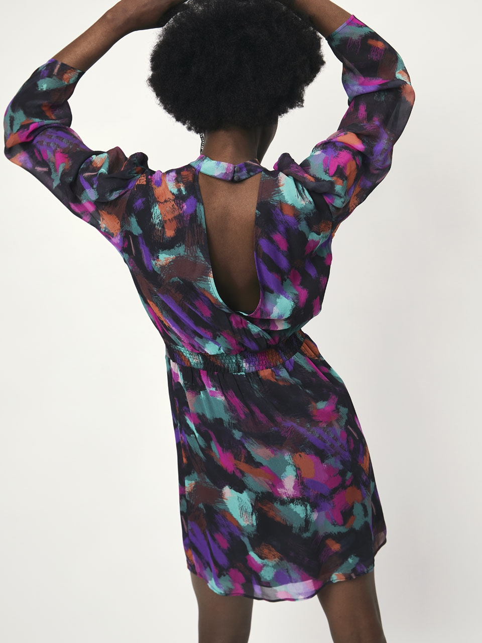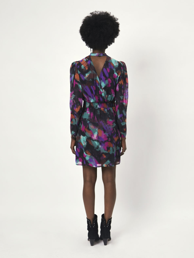 Choose this printed viscose crepe georgette mini dress for your next dinner or cocktail invitation. This dress is designed with a small stand collar and puffed sleeves. The highlight of this dress is the deep back opening, offering a sensual glimpse of skin. The expressionist colourful print will make you stand out in a crowd.