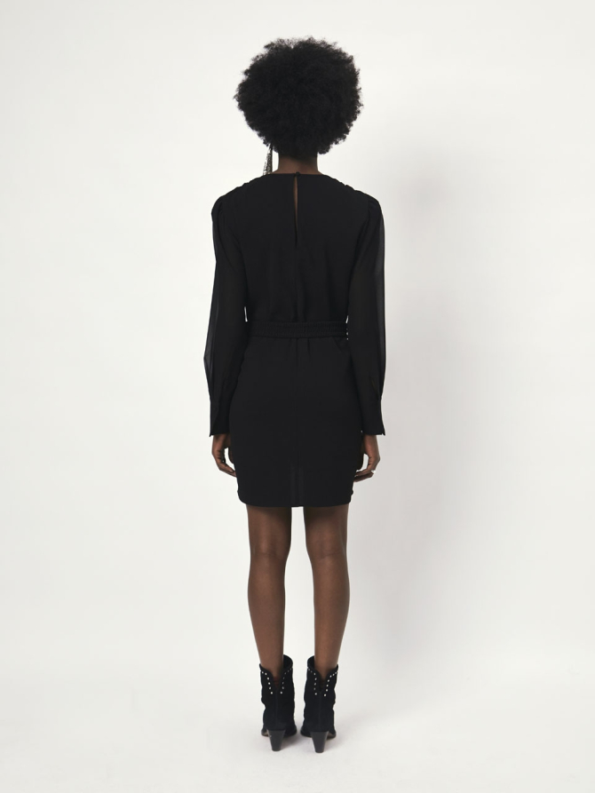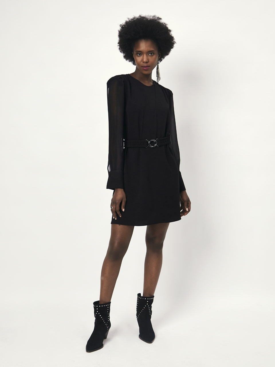 This little black dress is a worthy addition to your wardrobe. Our take on the classic dress is a play of transparent and opaque fabrics, creating a sensual look. The transparent sleeves are accentuated with gathers at the shoulders and end in a high opaque fabric cuff. The dress has a deep transparent V-Shaped inset, with a round neckline. It is delivered with a matching belt.
