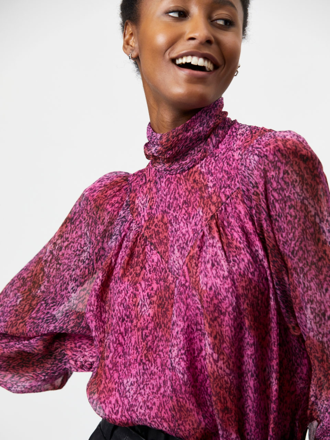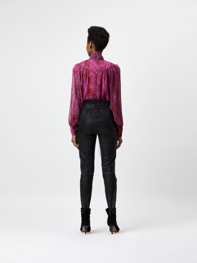For a blouse with a point of difference, consider the Callista drapey top with a print in shades of pink and red. Cut from a crinkled printed viscose chiffon, the design has a high neck and buttoned cuffs. Match yours with a Dante6 leather pants and be ready for any occasion.