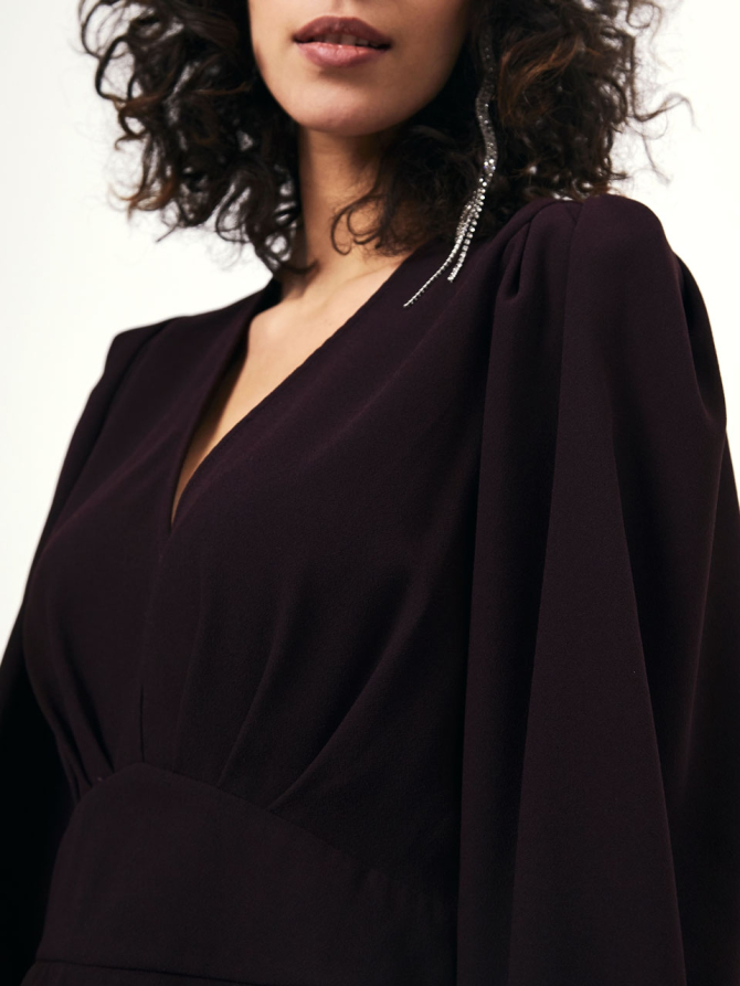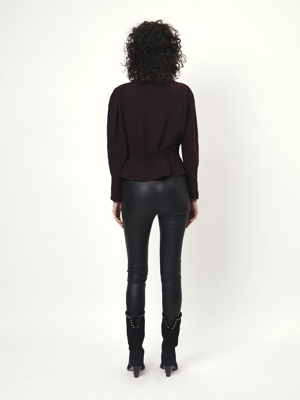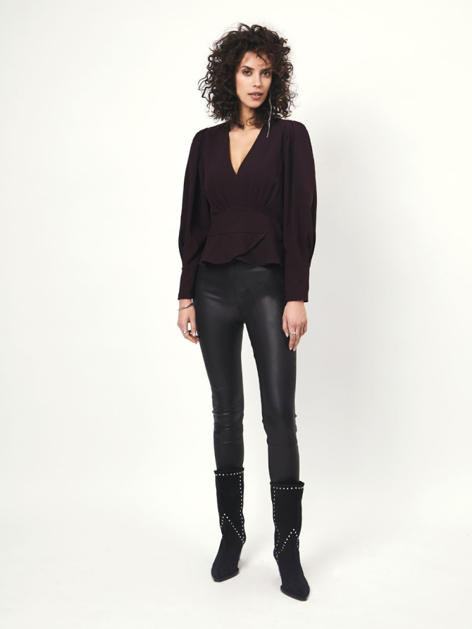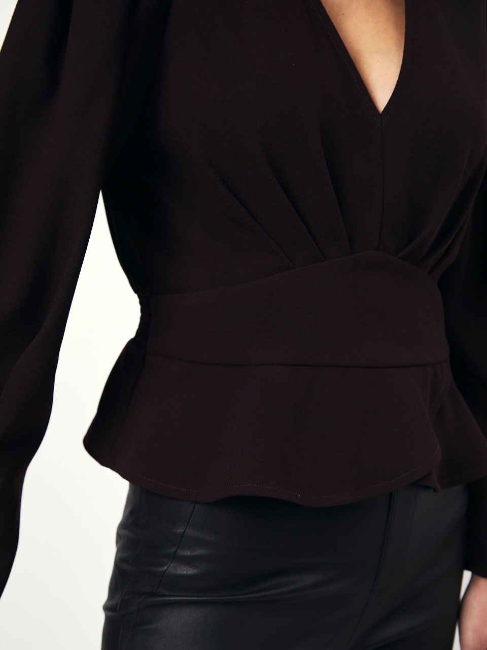 The D6Sawyer peplum top in Dark Grape is the perfect item to wear from work to party. This blouse has an elasticated seam at the waist that creates a nice fitted shape. Made of a satin back crepe that falls lightly and comfortably. The top features accentuated pleated puffed sleeves with pleating around the stitching. Wear this top with a pair of leather pants for an easy-going everyday outfit or combine it with suit pants for a smart office look.