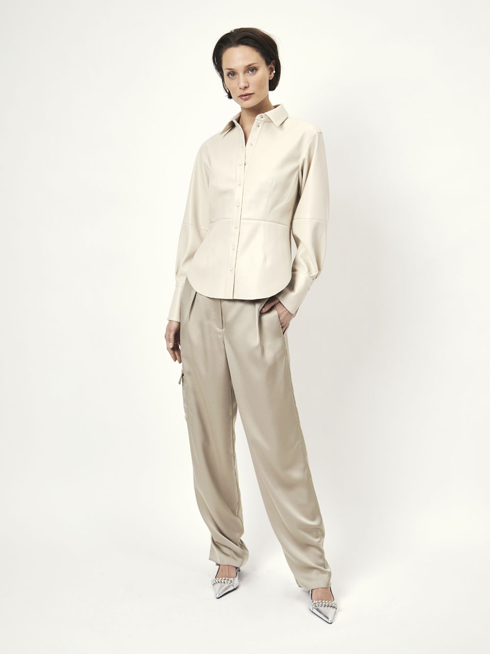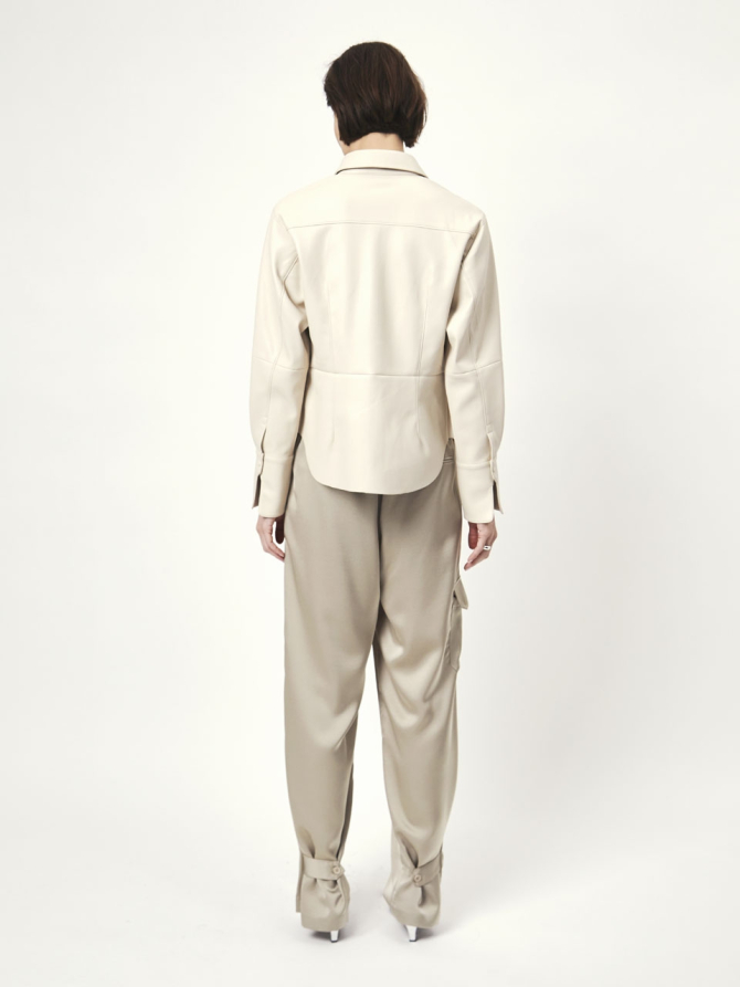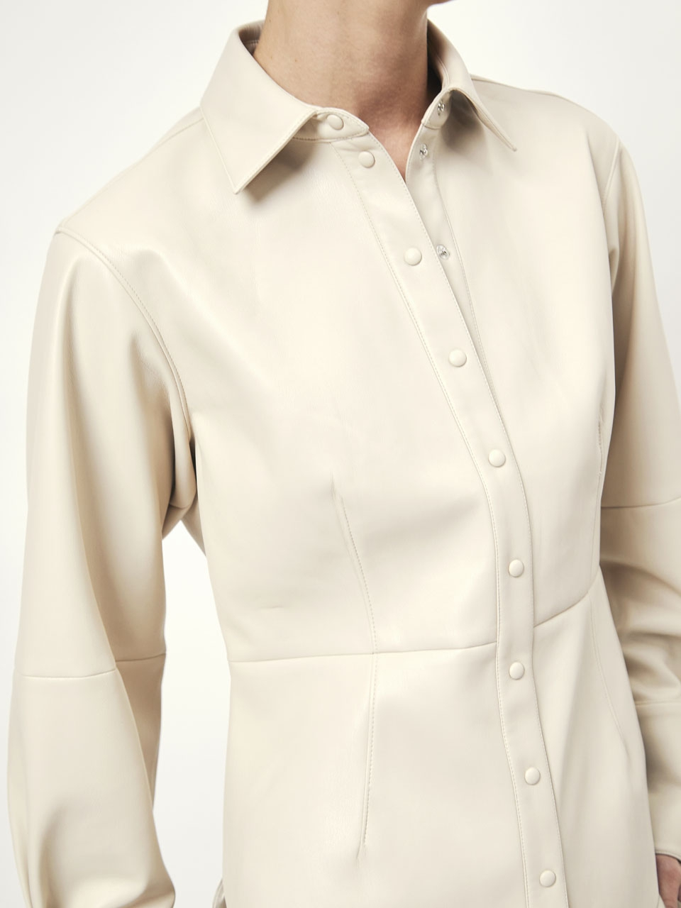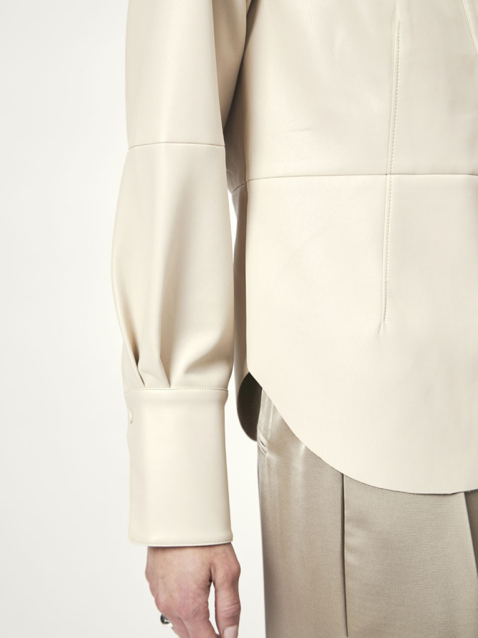 Make an entrance with this faux leather shirt in the colour Chalk. This shirt has a tailored fit and creates a beautiful silhouette with its high cuffs and slightly voluminous sleeves. It is characterized by its visible seams and darts.