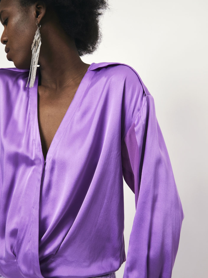 Get the soft touch of silk with this feminine wrap top. The top has an elasticated waist and pleats at the front. With its contrast fabric elements at sleeves and back, this luxury top is suitable for any occasion.