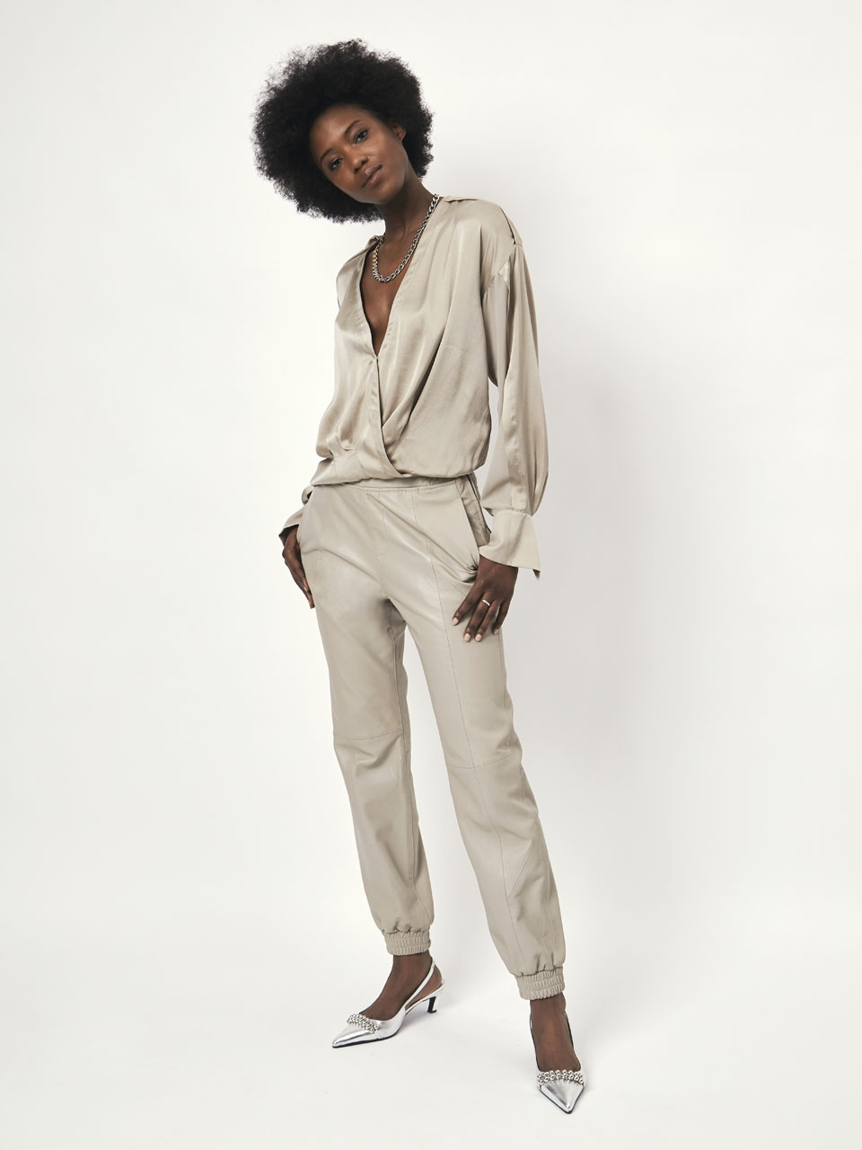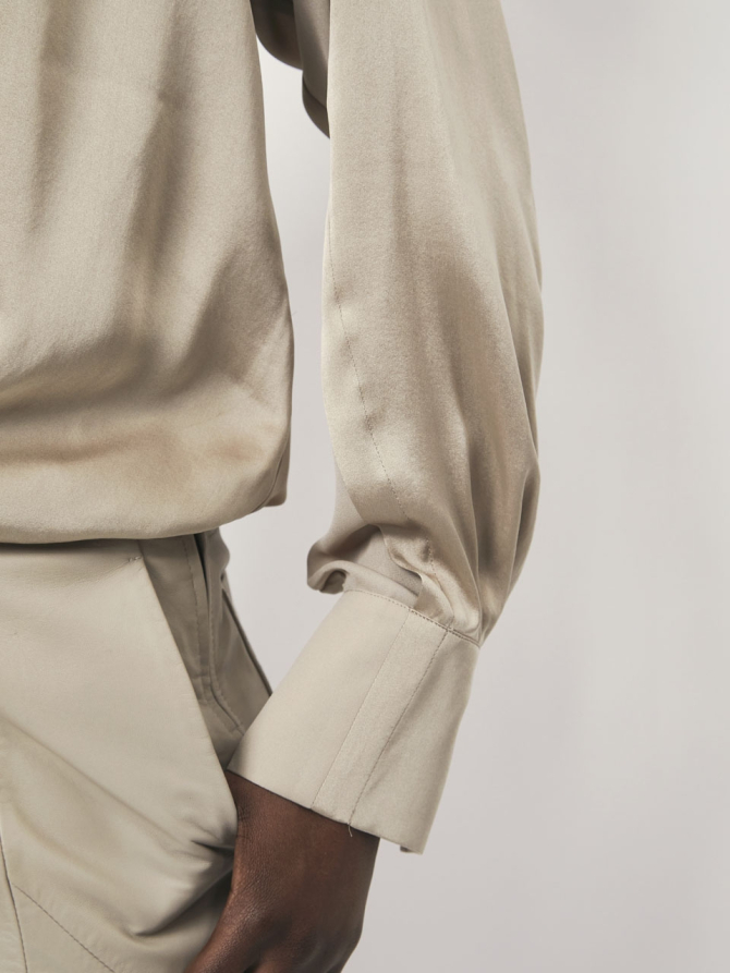 Get the soft touch of silk with this feminine wrap top. The top has an elasticated waist and pleats at the front. With its contrast fabric elements at sleeves and back, this luxury top is suitable for any occasion.