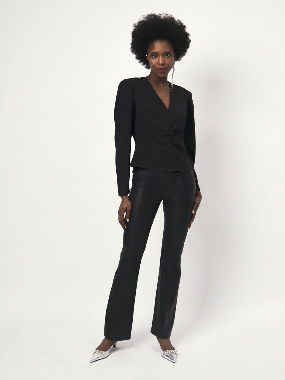 This is a great basic, high quality satin top for any occasion. It has long sleeves, a V-neckline with slight gathering along the front seam.