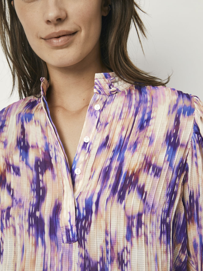 Looking for a new timeless printed style ? Choose our style D6Jacqui with long sleeves and a stand collar. It has a half hidden button placket and two decorative same fabric covered buttons to close the collar. The sleeves have gathers at the shoulders and elasticted cuffs with a frill. Wear it with any of our denims for a casual outfit.